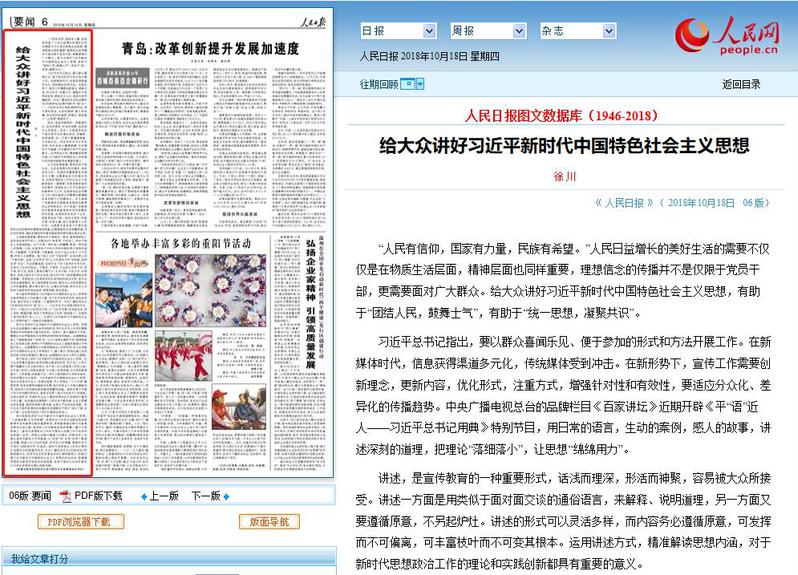 2018年10月18日,《人民日报》“要闻版”刊登公司公司党总支书记徐川的文章《给大众讲好习近平新时代中国特色社会主义思想》,现转发全文。