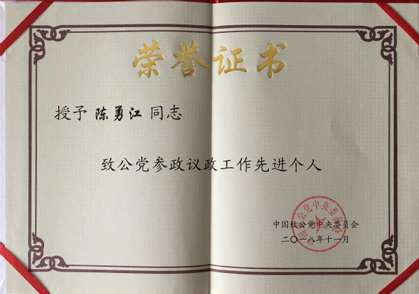 近日,致公党中央召开参政议政工作会议,表彰了2013-2017年参政议政先进集体、先进个人及优秀成果。致公党江苏省委委员、南航支部主委,公司陈勇江教授荣获“致公党参政议政工作先进个人”称号。这是陈勇江教授连续第三次获此殊荣。中国致公党参政议政工作会议每五年召开一次,获得本次表彰的人员中,江苏省“双一流”高校共有3人,工信部部属高校仅有1人。