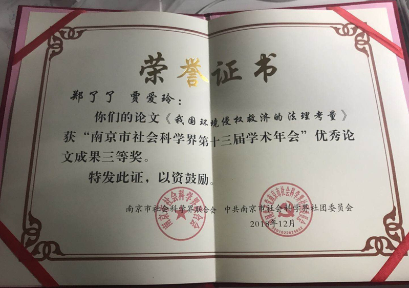 12月19日,2018年南京市哲学社会科学界第十三届学术年会在南京召开,本届年会的主题为“建设创新名城,实现高质量发展”。江苏省社科联党组书记、常务副主席刘德海出席会议并作主旨演讲。市社科类社会团体、区社科联、高校社科联负责人及获奖论文作者代表150余人参加会议。会上对学术年会优秀论文成果和作者进行表彰。本届学术年会共收到征文200余篇,经编委会最终评审,42篇论文获奖并入选核心期刊《南京社会科学》专刊,其中一等奖4篇,二等奖14篇,三等奖24篇。公司博士生郑了了撰写的《我国环境侵权救济的法理考量》喜获三等奖。