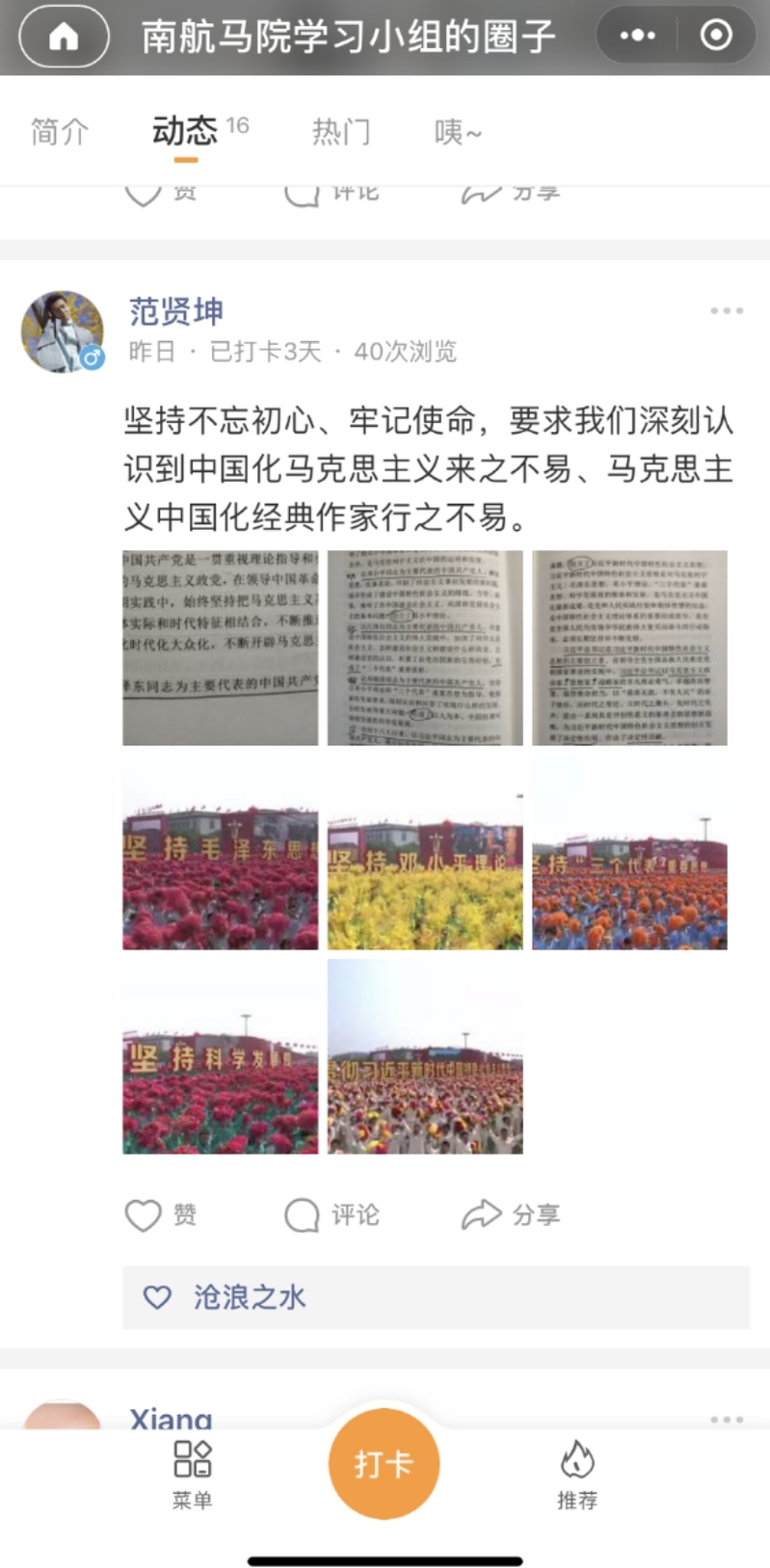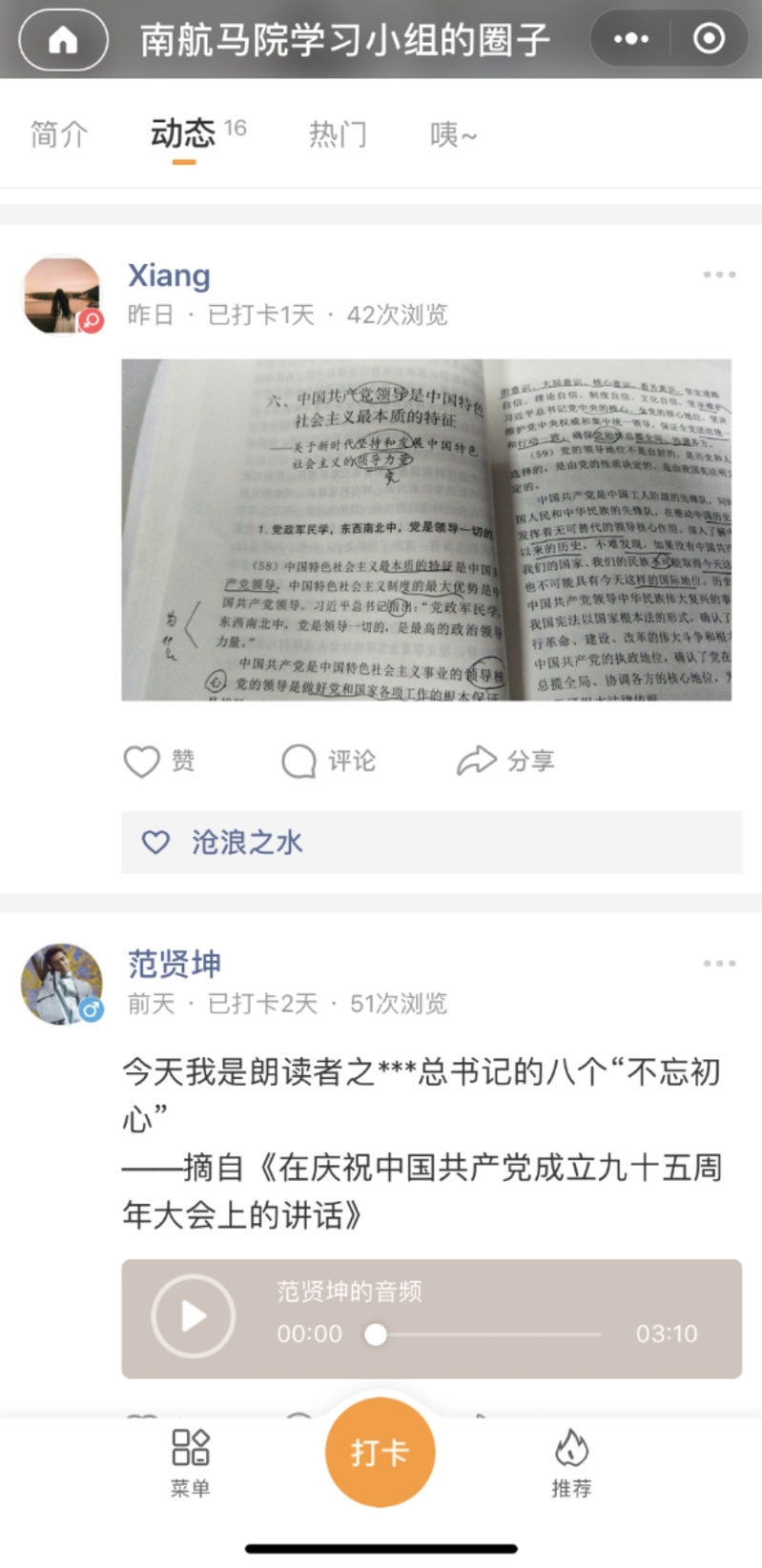 在主题教育中,伟德bv1946官网把员工党支部的学习教育摆在突出位置,深入研究新形势下员工党员思政工作的规律和特点,把主题教育和新技术新手段结合起来,运用微信小程序建立“南航马院学习小组”,引导员工党员和积极分子主动学习“打卡”,在专区分享个人学习语音、文字、图片和感悟。同时借鉴互联网社区管理方法,采用每周每月排名奖励的方式,在专区融入用户成长体系,形成了比学赶超的良好氛围,让学习教育有趣有效。此外,马院员工党支部还通过领航学堂学习、观看《周末理论大讲堂》在线课程、“读原著学原文悟原理”系列活动等途径,让主题教育更有“理论味”“信仰味”。