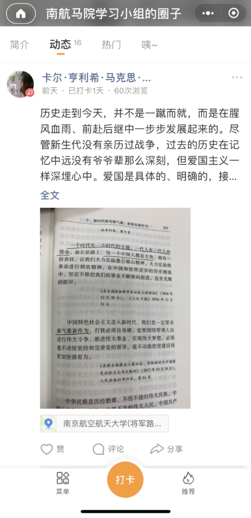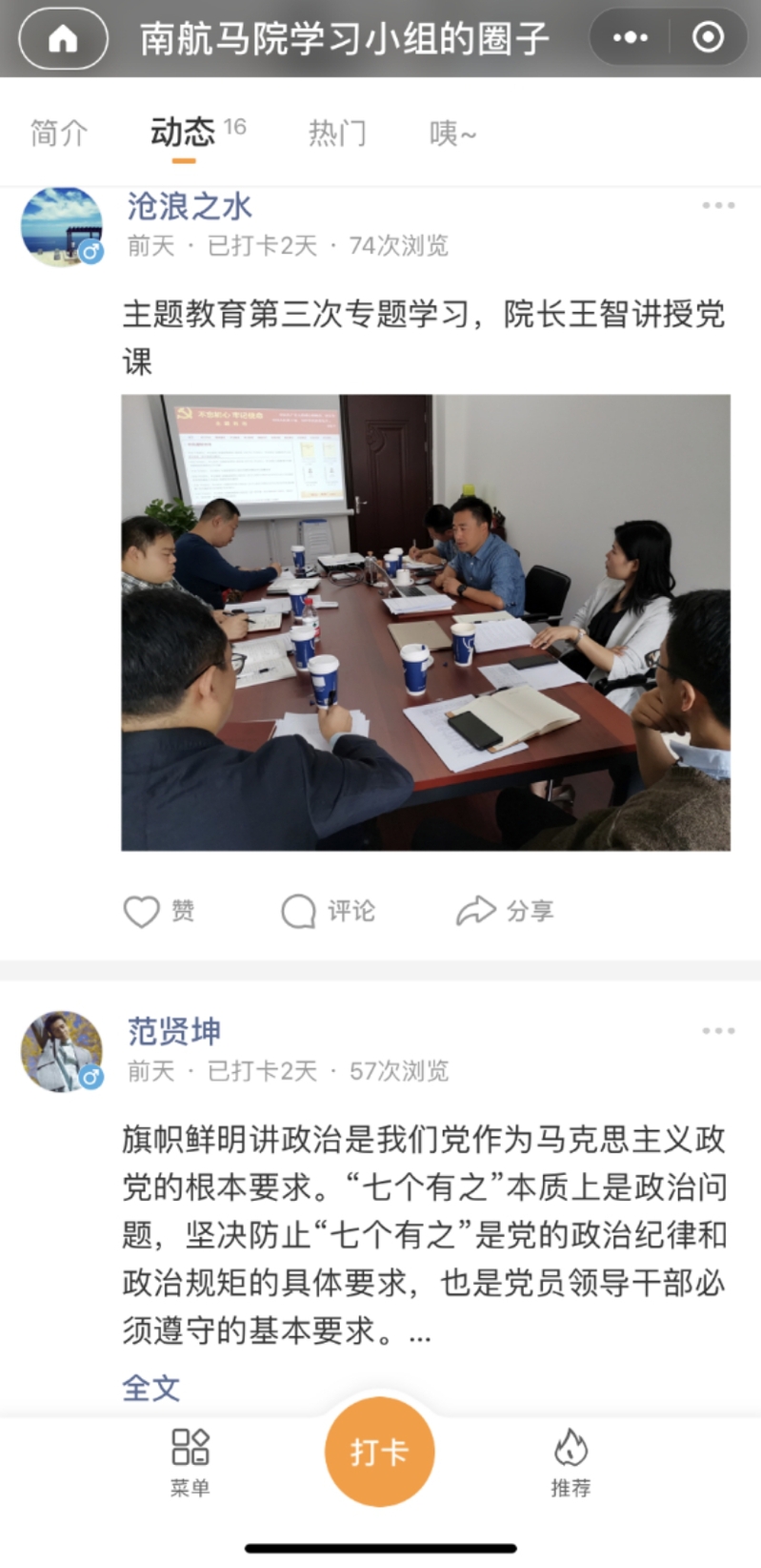 在主题教育中,伟德bv1946官网把员工党支部的学习教育摆在突出位置,深入研究新形势下员工党员思政工作的规律和特点,把主题教育和新技术新手段结合起来,运用微信小程序建立“南航马院学习小组”,引导员工党员和积极分子主动学习“打卡”,在专区分享个人学习语音、文字、图片和感悟。同时借鉴互联网社区管理方法,采用每周每月排名奖励的方式,在专区融入用户成长体系,形成了比学赶超的良好氛围,让学习教育有趣有效。此外,马院员工党支部还通过领航学堂学习、观看《周末理论大讲堂》在线课程、“读原著学原文悟原理”系列活动等途径,让主题教育更有“理论味”“信仰味”。
