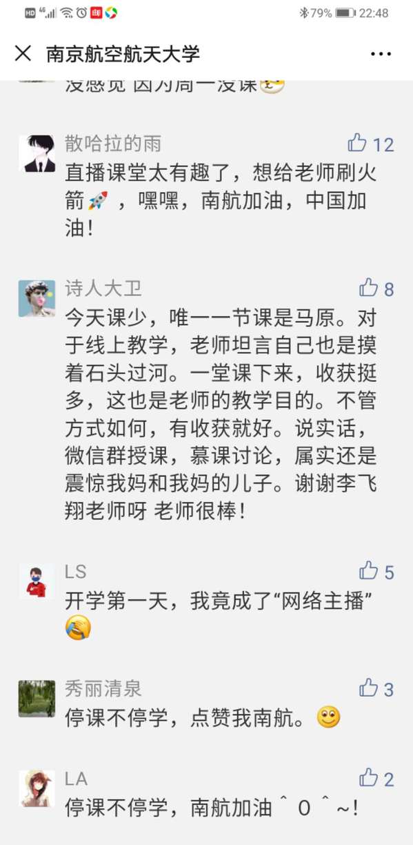 “非常时期,非常课堂,非常精彩”。224日是线上新学期的第一天,依托南航精品课程(在线教学)平台,综合运用超星学习通、雨课堂、慕课堂等教学工具以及华为Welink 、腾讯会议等视频工具,老师们以饱满的精神状态开启了新学期第一堂课,线上教学情况良好,顺利完成当天教学任务。