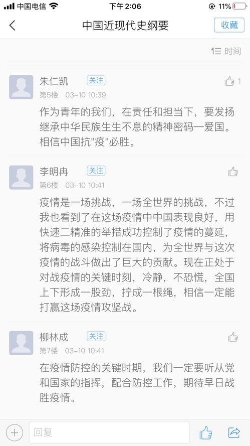 陈红桂老师的《马克思主义基本原理概论》培优班课堂中王若凡同学留言很有代表性,反应了许多同学共同心声,他写到“实现中华民族的伟大复兴必然要面对具有许多新的历史特点的伟大斗争。在此次抗击疫情的过程中,中国共产党作为最高领导力量,统一领导协调各方,全民万众一心、同舟共济,显现出了我国巨大的制度优势。多难兴邦,在历史上中民族面对过诸多的磨难,并从中总结了经验。在此次疫情中,中国将古代有效方法和现代科学技术有机结合,形成了一套行之有效的方案。作为一个大国,中国有着开放的胸襟和责任担当,为世界提供了宝贵的防疫窗口期和可之借鉴的防疫经验。这也符合我国一向主张的构建人类命运共同体的原则,各国相互联系、相互依存,共同发展。通过这次战疫,我们也看到了中国青年一代的勇气和担当。没有人天生是英雄,是责任和担当让青年们一边恐惧、一边勇敢的破茧成蝶。也正是这一代人一代人接棒式的担当和使命让中华文明传承五千年”。