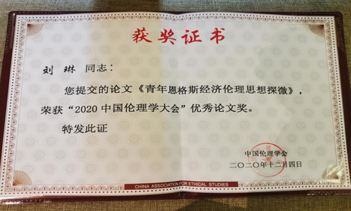 公司刘琳教授和博士生吴晨晟同学受邀参会,与诸多学者进行了丰富的学术交流与探讨。刘琳教授在大会分论坛“马克思主义伦理思想论坛”发表主题学术报告,论文《青年恩格斯经济伦理思想探微》荣获“2020中国伦理学大会”优秀论文奖。吴晨晟同学做了题为《马克思主义视阈下的私有资本下乡与乡村经济伦理》的发言。