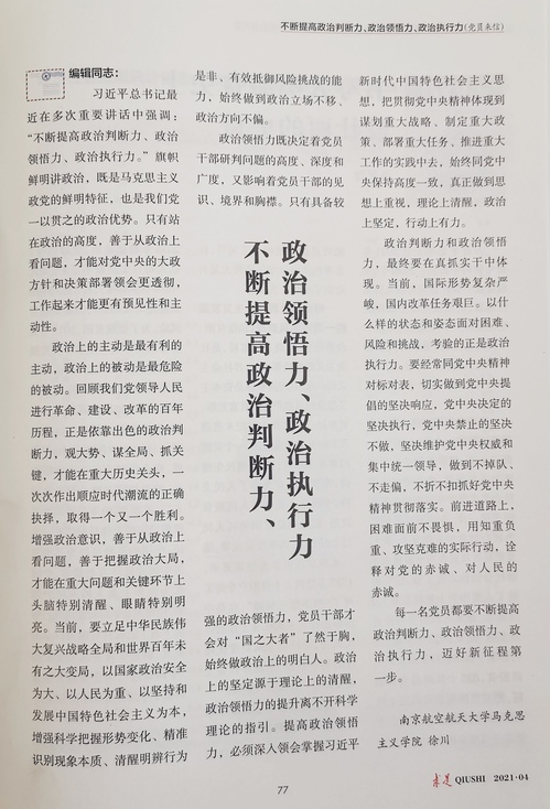 2月16日,《求是》杂志2021年第4期刊发公司党委书记徐川教授的文章《不断提高政治判断力、政治领悟力、政治执行力》,现将全文转发如下:
