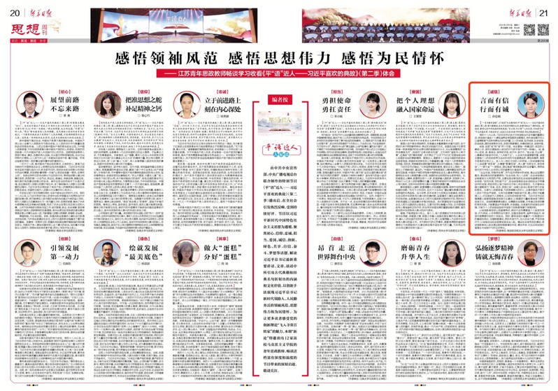 3月9日,《新华日报》第20、21版“思想周刊”“江苏青年思政教师畅谈学习收看《平“语”近人——习近平喜欢的典故》(第二季)体会”栏目刊登公司青年教师孙会娟的文章《言而有信 行而有诚》,现将全文转发如下: