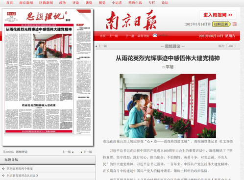 习近平总书记关于伟大建党精神的深刻诠释,确立了伟大建党精神是中国共产党红色精神之源的历史地位,构筑了党在不同历史时期形成的各种精神的基因和内核,雨花英烈用鲜血和生命铸就的雨花英烈精神,传承和发展了伟大建党精神的精神实质,是中国共产党人的精神谱系的重要组成部分,也是南京人民极其宝贵的红色资源。我们要走近雨花英烈,从雨花英烈的光辉事迹和崇高精神中感悟伟大建党精神的深刻内涵,自觉做伟大建党精神的忠诚践行者,让伟大建党精神在全面建设社会主义现代化国家、实现中华民族伟大复兴中国梦的伟大进程中绽放时代光芒。
