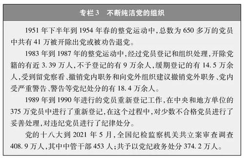 在革命、建设、改革中,中国共产党面临着形形色色的考验。外部世界的各种诱惑,管党治党的松懈松弛,党员思想行为的不良变化,都会对党的肌体造成侵害。党坚决同影响党的先进性、弱化党的纯洁性的各种现象作斗争,不断医治病症,坚决铲除毒瘤,保持肌体健康。