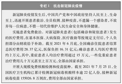 人民生活极大改善。中国人民摆脱绝对贫困,从总体小康到全面小康,过上了日益富足的生活,获得感幸福感安全感不断增强,生存权发展权有效保障。人均国民总收入超过1万美元,处于中等偏上收入经济体行列,正在向高收入国家迈进。城乡居民生活水平差距大幅缩小,形成了超过4亿人的世界上规模最大的中等收入群体。就业局势保持总体稳定,截至2020年底,全国就业人数为75064万人。中国建成世界上规模最大的社会保障体系,截至2021年6月底,全国基本养老、失业、工伤保险参保人数分别达到10.14亿人、2.22亿人、2.74亿人,基本医疗保险覆盖超过13亿人。健全完善社会救助制度,困难群众基本生活有效保障。幼有所育、学有所教、劳有所得、病有所医、老有所养、住有所居、弱有所扶更好实现。文化事业和文化产业繁荣发展,人民的精神生活更加丰富、更加活跃。生态文明建设取得丰硕成果,人民生活的家园天更蓝、山更绿、水更清。中国长期保持社会和谐稳定、人民安居乐业,是世界上公认的最有安全感的国家之一。