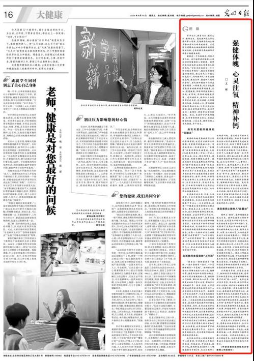 9月10日出版的《光明日报》刊登了公司党委常委、宣传部/教师工作部部长、公司研究生导师王晖的理论文章《强健体魄 心灵注氧 精神补钙》,现将全文转发如下: