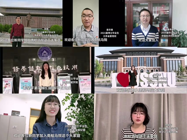 院友代表竞辉、易华勇、潘承彬、杨婷、章碧希、陈晓宇、王鑫通过视频为学弟学妹们送上了真挚的祝福。