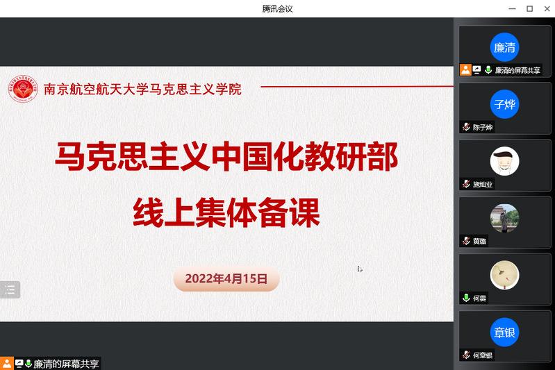 4月15日,马克思主义中国化教研部进行了线上集体备课。此次备课围绕“保障和提高疫情防控期间线上教学质量”和“将十九届六中全会精神融入概论课”两个主要议题展开,由马克思主义中国化教研部主任廉清主持,经理王智、副经理何畏以及教研部全体教师参与了线上集体备课。