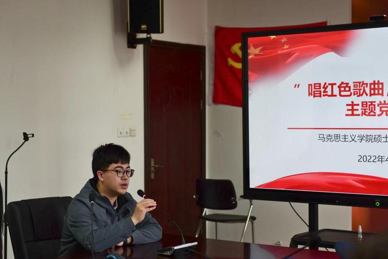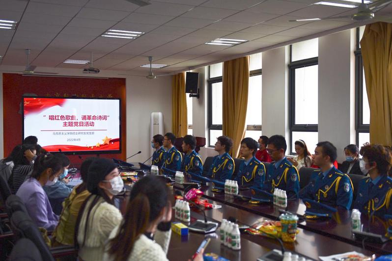 为了丰富疫情防控封校期间的支部教育活动形式,扎实推进“不忘初心、牢记使命”的主题教育,在中国共产主义青年团建团100周年之际,公司硕士研究生党支部于4月17日下午联合校国旗班共同举办以歌颂党、歌颂祖国为内容的主题党日活动。本次活动由支部组织委员刘烨晖主持,党支部全体党员、入党积极分子参加活动。