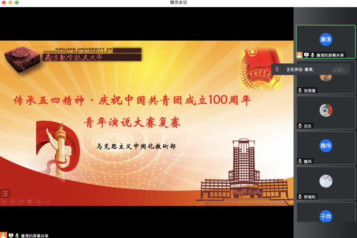 为更好地将教学与实践相结合, 伟德bv1946官网中国化教研部连续5年举办特色实践活动——“青年演说大赛”。五四将至,今年的“青年演说大赛”以传承五四精神、庆祝中国共青团成立100周年为主题,各“概论”课班级的同学踊跃参加,精心准备了各类节目。经过前期初赛选拔,4月25日,马克思主义中国化教研部通过线上形式开展了今年“青年演说大赛”的决赛选拔工作。教研部主任廉清主持选拔工作,各节目指导教师均参与评审,节目以视频形式展示,共计18个精彩节目最终入围决赛。