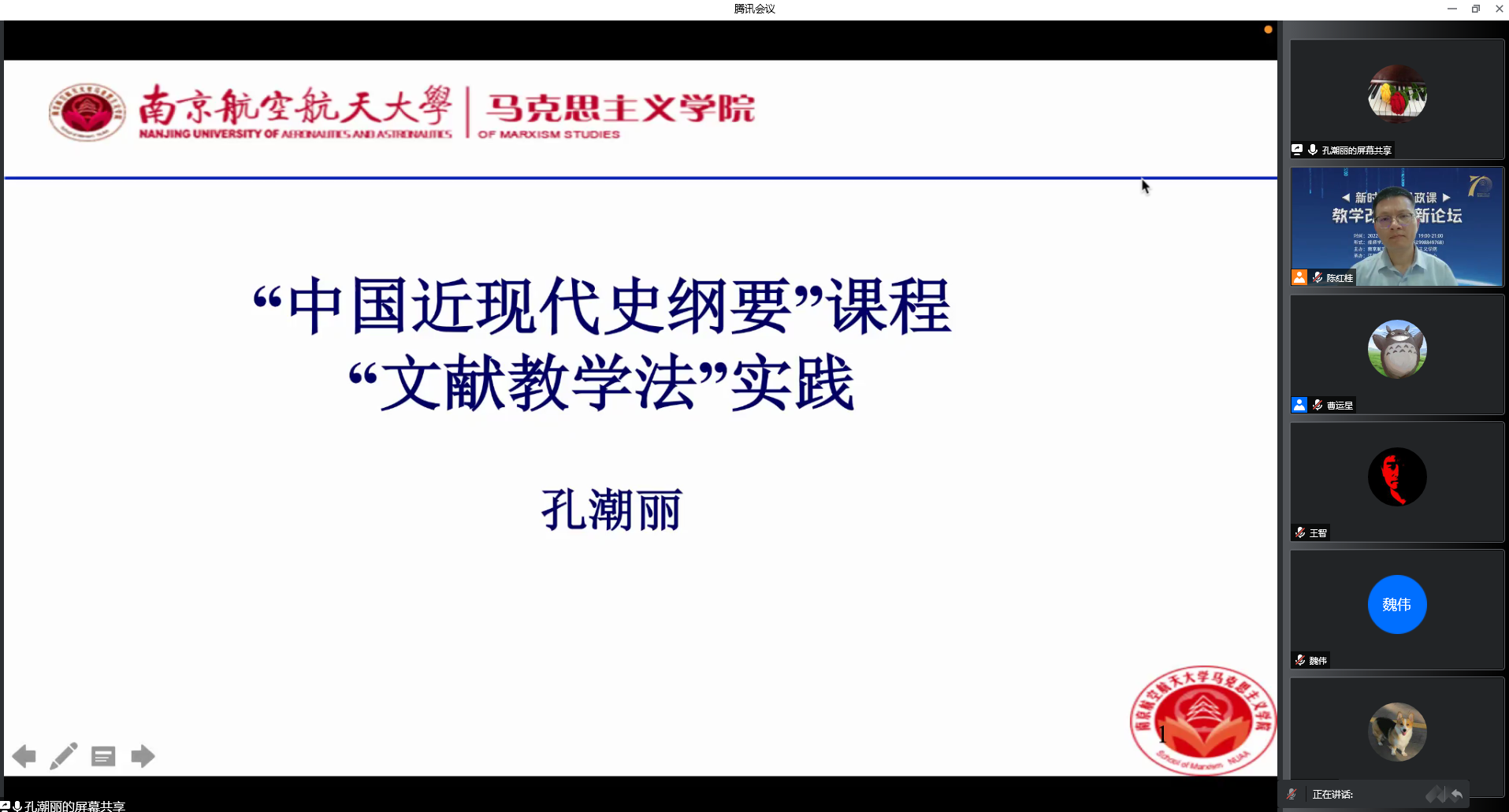 孔潮丽老师聚焦“中国近现代史纲要”课程的“文献教学法”。她从文献的类型、来源、运用以及实际教学中文献教学法优缺点着手分享了她在教学改革中的探索。认为教师可以引用文献阐述某种观点,加深员工对教材内容的理解,讲解教材的重点和难点,对教材知识进行补充和拓展。“文献教学法”使课程内容丰富,逻辑严谨,也更有说服力。教师如何选择、获取文献,并将文献适当地应用于教学当中,需要思考和探索。