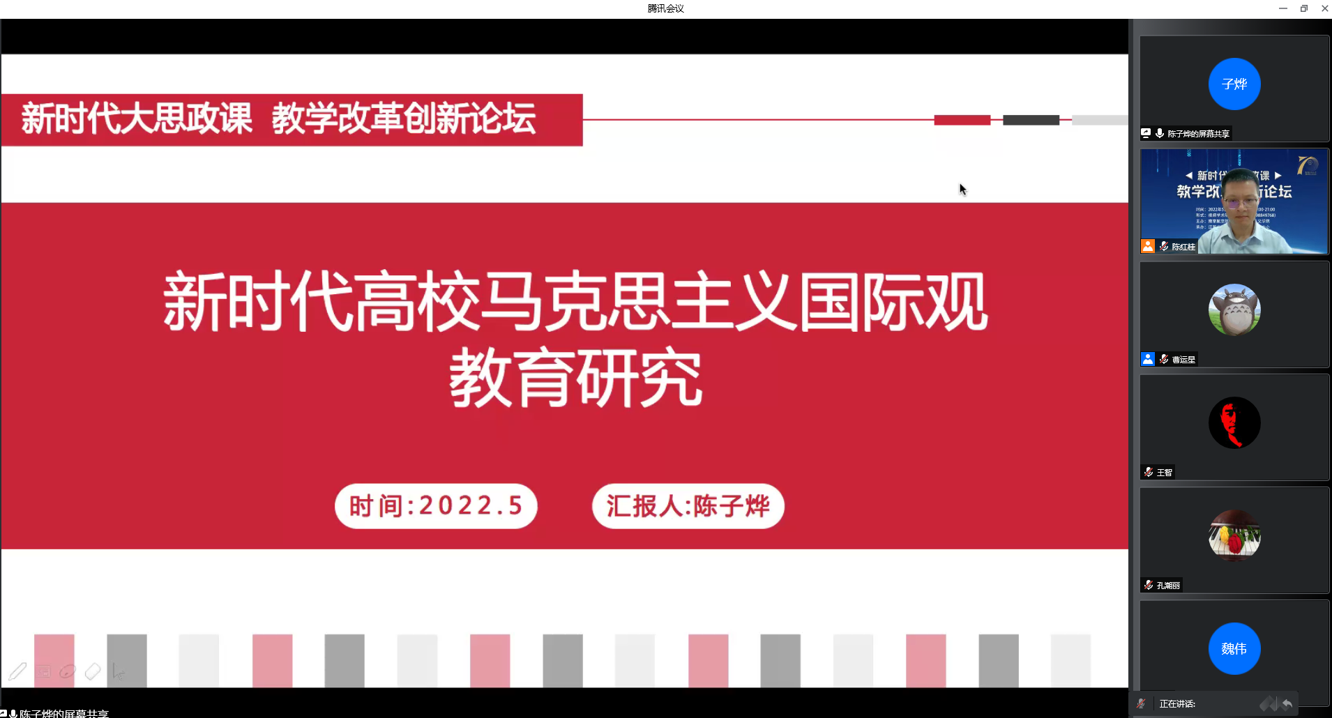陈子烨老师分享了有关“新时代高校马克思主义国际观教育”的研究体会。她认为高质量的国际观教育对员工发展非常必要。但高校既有的国际观教育的效果仍有待优化。应该从建设课程体系、重构教学内容、探索教学方法和强化教学实践几个方面重点探索优化之路。