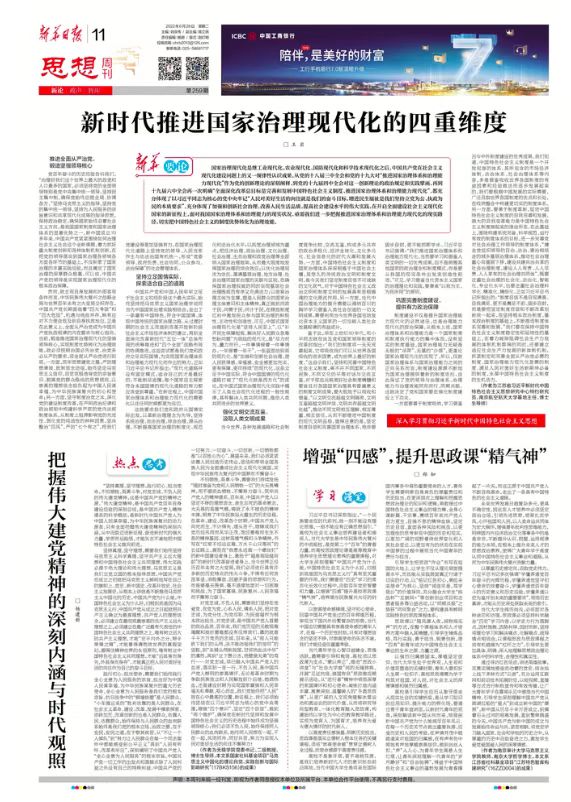 6月28日,《新华日报》第11版“思想周刊”栏目刊登了江苏省中特中心南航基地主任、公司王岩教授的理论文章《新时代推进国家治理现代化的四重维度》,现将全文转发如下: