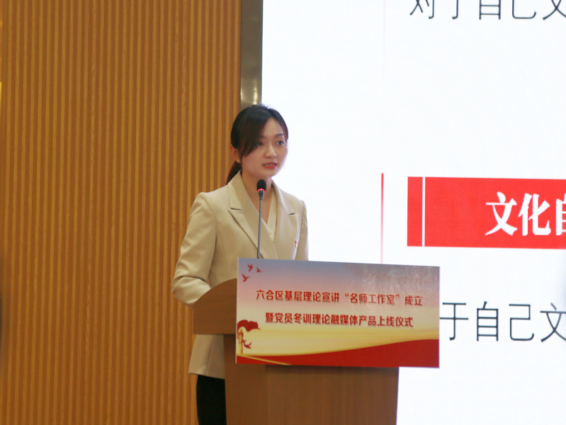 活动中,六合区基层理论宣讲“名师工作室”正式成立。公司教师陈红桂、刘亮、胡媛媛、陈子烨以及东南大学、南京信息工程大学的7名教师共同获聘为导师,每位导师分别结对3名学员,通过“名师结对”“传帮带”,助力越来越多优秀理论宣讲者在六合持续涌现,不断为六合实践发声、为理论传播助力。