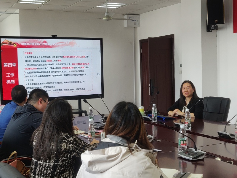 培训中,袁颖从支部标准化建设展开讲解。她指出,党支部标准化建设应当从组织设置标准化、班子建设标准化、工作机制标准化、组织生活标准化及教育管理标准化等五个方面开展。袁颖以领学《中国共产党支部工作条例(试行)》的方式,对开展工作过程中需要注意的重点及难点作了详细叙述。为帮助与会人员更好地理解相关问题,她多次举例说明其中的不同之处。随后,她结合《中国共产党党员教育管理工作条例》,讲解了应当如何切实有效开展党员教育管理工作。首先,党支部在日常工作中应当坚持教育、管理、监督、服务相结合,推进党员学习教育常态化制度化,不断增强党员教育管理的针对性和有效性,努力建设政治合格、执行纪律合格、品德合格、发挥作用合格的党员队伍。其次,她从党员教育管理的7个基本任务和5种主要方式出发,讲述了党支部的定位、职责及如何开展各项具体工作。