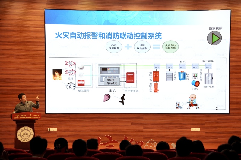 侍孝永以“坚守平凡,自立自强”为主题,首先,侍孝永以消防安全事故为例,为同学们详细介绍了火灾自动报警系统和消防联动系统,强调了掌握消防安全基础知识的重要性。其次,侍孝永分享自己参加全国消防行业职业技能大赛的经历,希望同学们磨练心力和钻研技能,还结合自身长期从事的消防安全工作,鼓励大家无论遇到何种考验都要拥有“坚守平凡,自立自强”的意志,具备坚定的信念和强烈的责任心,时刻保持清醒的头脑,不断提高自身的专业素养。最后,他寄语同学们,日常学习要从细微之处下手,持之以恒,在自己的专业领域钻研,充分发挥自己的特长与优势,实现自我价值。